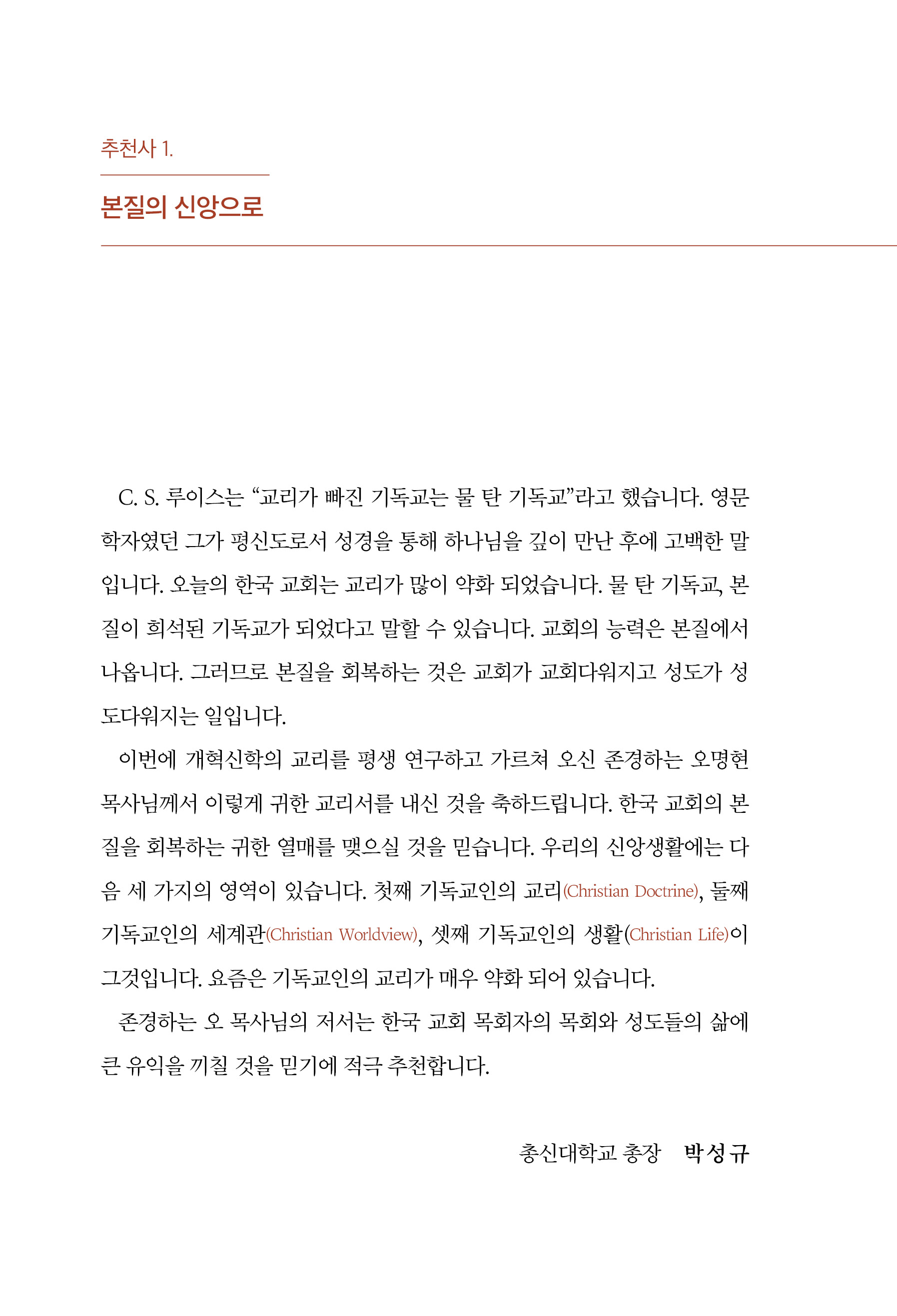 이 책은 교리를 단순한 지식이 아니라, 복음의 핵심을 붙드는 기둥으로 제시합니다. 복잡한 내용을 쉽게 풀어내면서도 본질을 놓치지 않으며, 독자가 성경의 큰 흐름 속에서 자신의 신앙을 점검하도록 돕습니다. 혼란한 시대 속에서 바른 길을 찾고자 하는 이들에게 분명한 방향을 제시하는 책입니다.