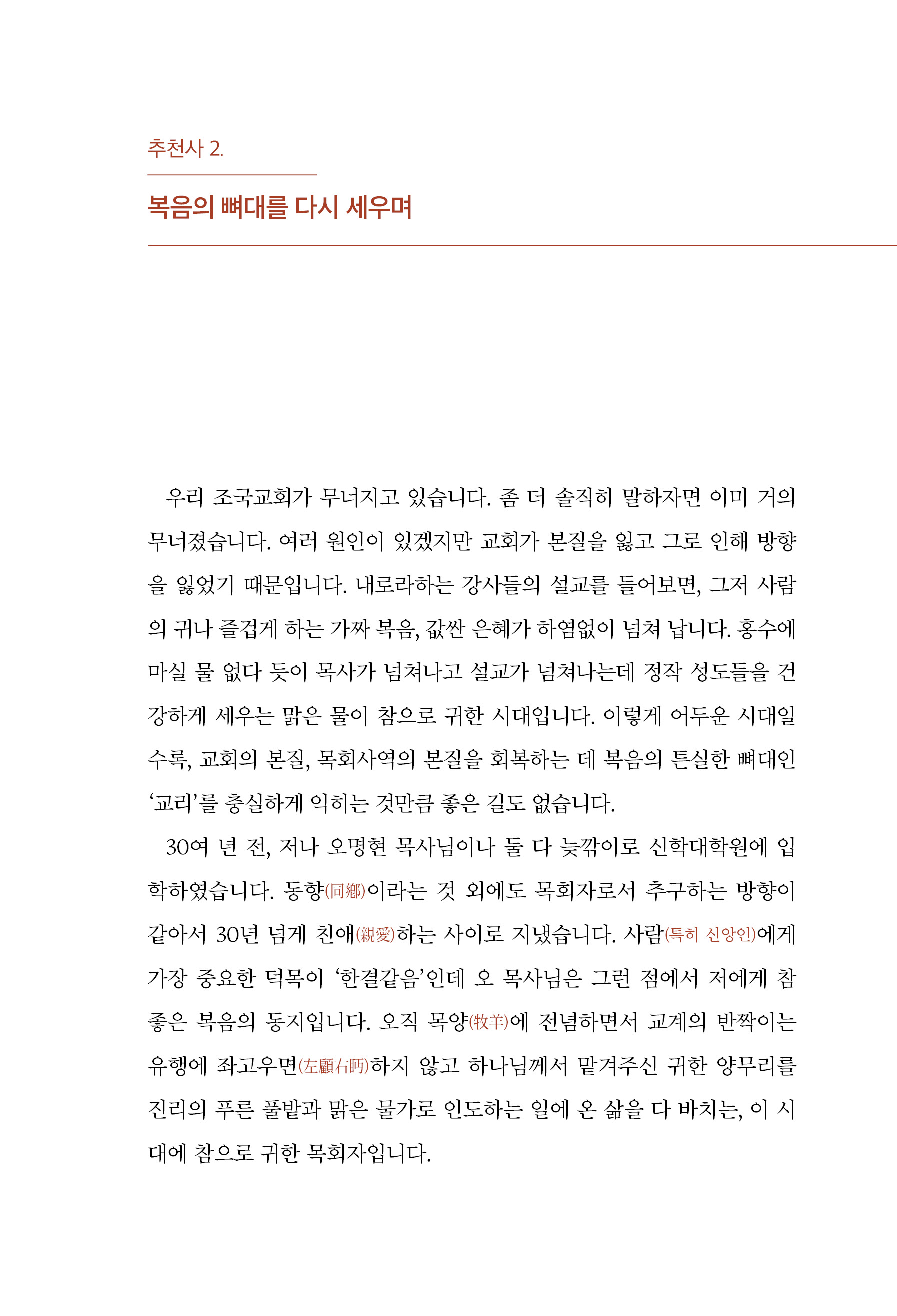 저자는 오늘날 신앙이 흔들리는 이유를 성경 전체를 관통하는 구속사의 흐름을 보지 못하는 데서 찾습니다. 단편적인 이해를 넘어, 교리를 통해 성경의 큰 길을 볼 때 비로소 신앙은 바로 서게 됩니다. 특히 성경을 본문으로 삼으면서도 그 의도에서 벗어난 ‘헛다리 설교’가 교회의 쇠퇴를 가져온다는 진단은 매우 통찰력 있습니다.